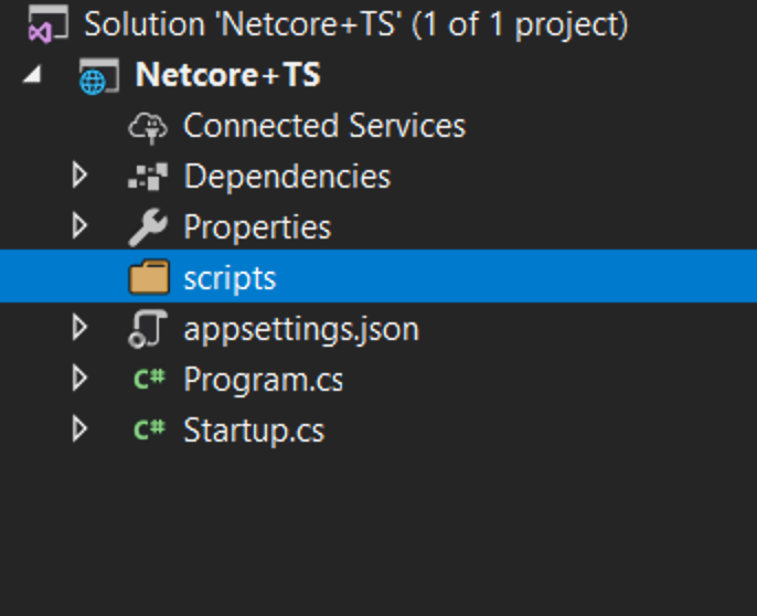 First we need to tell TypeScript how to build. Right click on scripts and click New Item. Then choose TypeScript Configuration File and use the default name of tsconfig.json